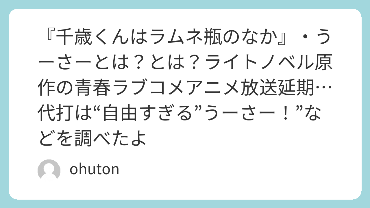 『千歳くんはラムネ瓶のなか』・うーさーとは?とは?ライトノベル原作の青春ラブコメアニメ放送延期…代打は“自由すぎる”うーさー!”などを調べたよ