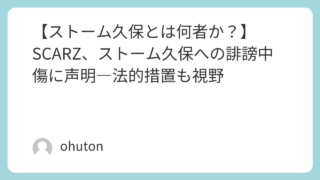 Games 【ストーム久保とは何者か?】SCARZ、ストーム久保への誹謗中傷に声明―法的措置も視野 【ストーム久保とは何者か?】SCARZ、ストーム久保への誹謗中傷に声明―法的措置も視野プロゲーミングチームSCARZは、所属ストリーマー「ストーム久保」氏に対する悪質な誹謗中傷が続いているとして、公式声明を発表しました。声明では、選手や配信... 2025.10.03 Games