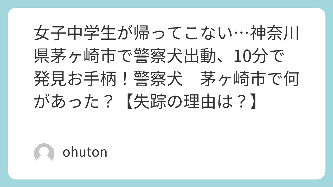 女子中学生が帰ってこない…神奈川県茅ヶ崎市で警察犬出動、10分で発見お手柄!警察犬 茅ヶ崎市で何があった?【失踪の理由は?】